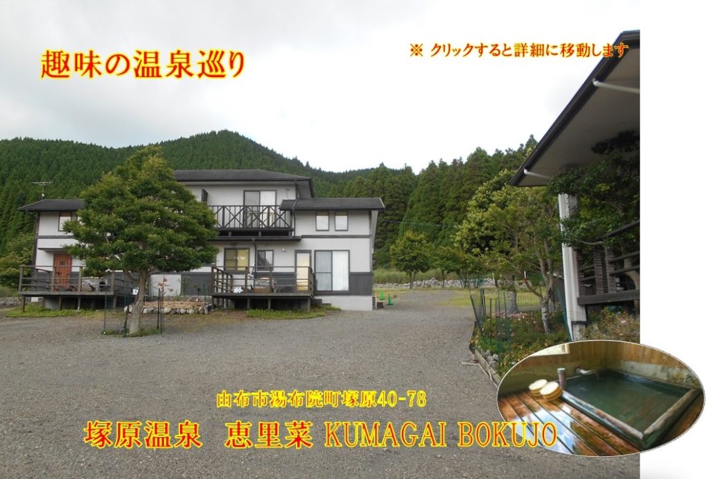湯布院町 塚原温泉 / 由布市 / By 大分県の温泉めぐり 火口乃泉 山荘 四季庵 御宿 由布乃庄 奥宿 無相荘 恵里菜 KUMAGAI BOKUJO 森の宿 野乃花 貸別荘 風の里 山荘 ペンションつきの熊 フォレスト イン ボン 湯布院温泉 温泉マップ 画像をクリックすると 詳細から目的地を検索できます。